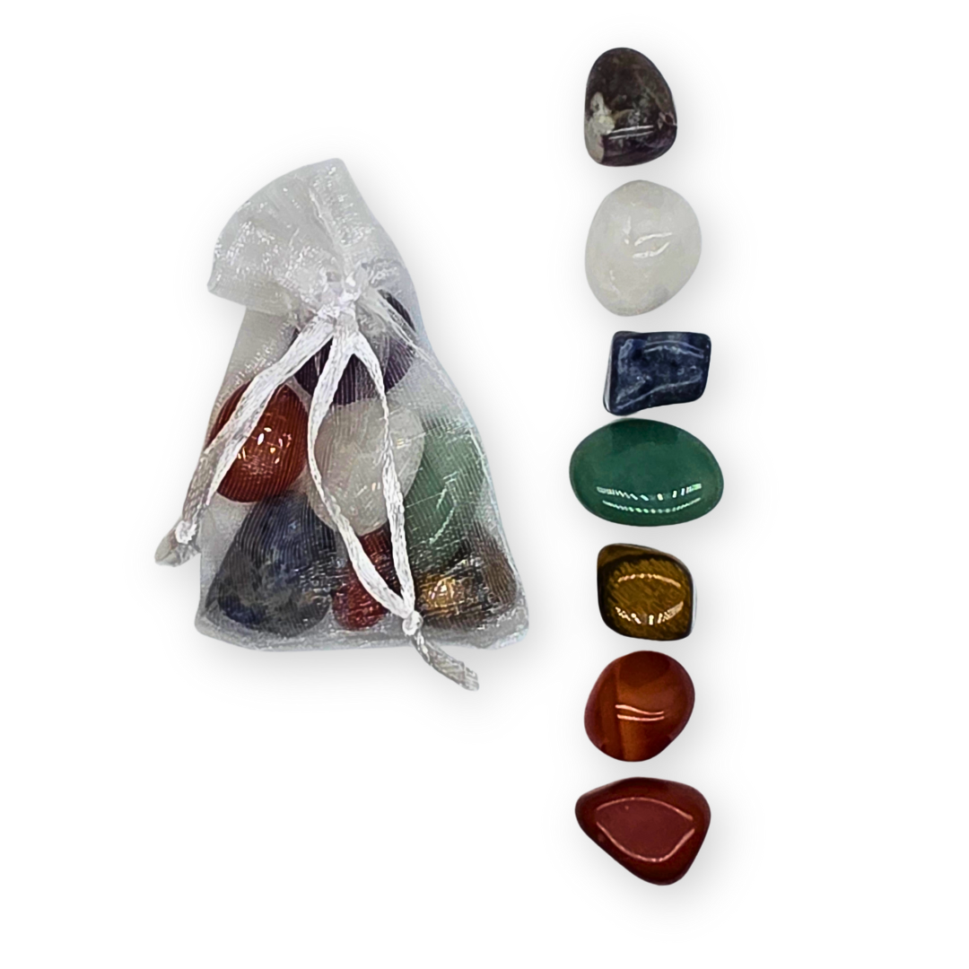 Bij elke chakra zit een andere steen die precies hoort bij deze chakra, net zoals de kleur en de intentie. De edelstenen zijn verschillend, meestal zit er amethist, rode jaspis en bergkristal in het zakje.