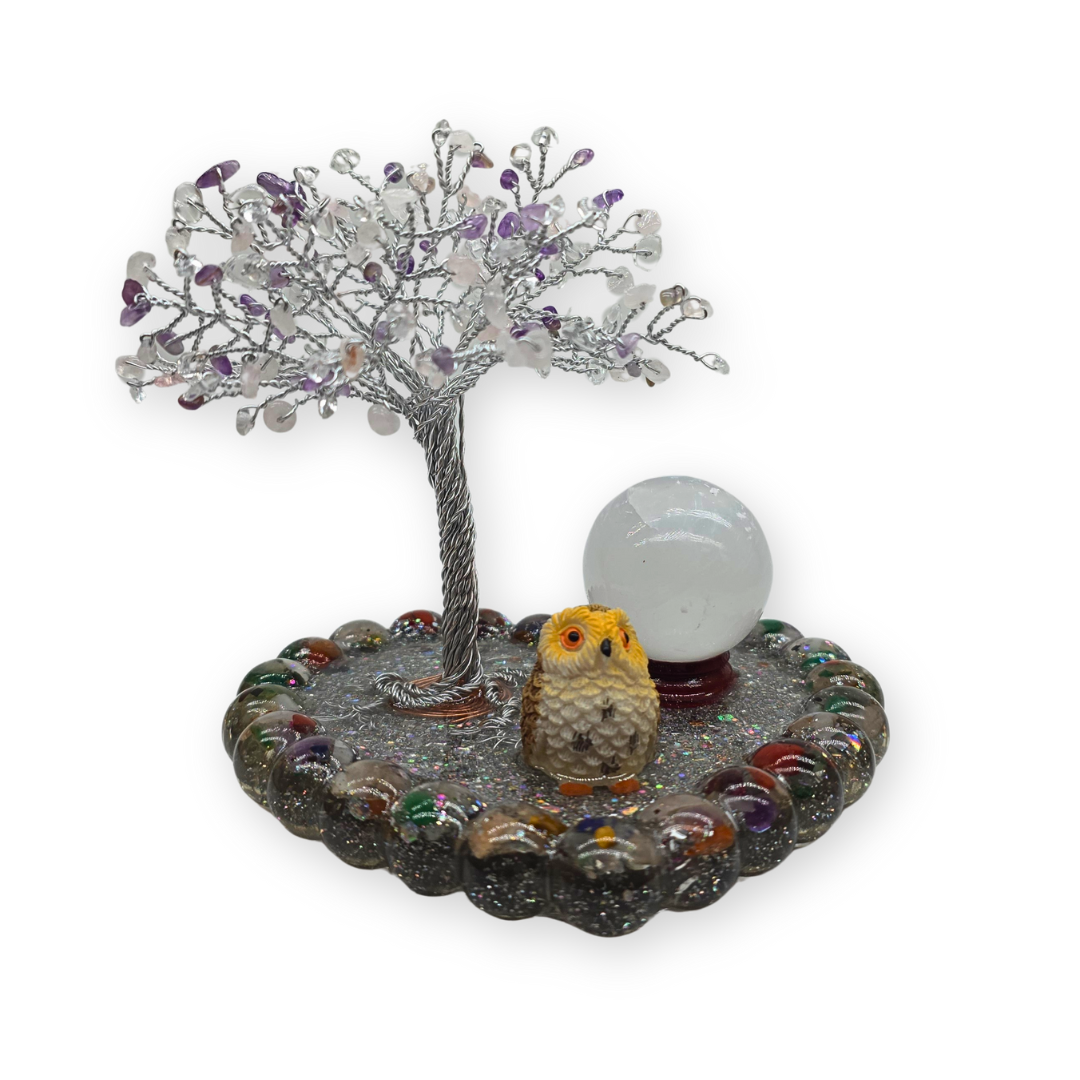 Mooie levensboom met de gouden driehoek, een bol van seleniet en een uil.