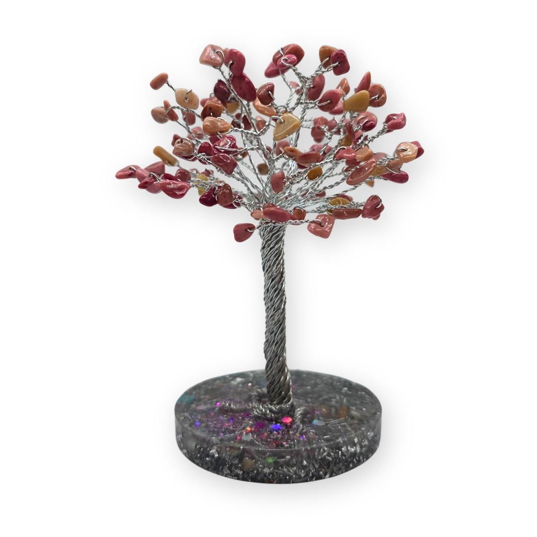 Materialen: Rhodoniet, Diverse edelstenen, Aluminium, Koper, Doterra olie: Arborvitae (levensboom). - Afmeting: Deze levensboom is ca. 14 cm hoog en ca. 10 cm breed.